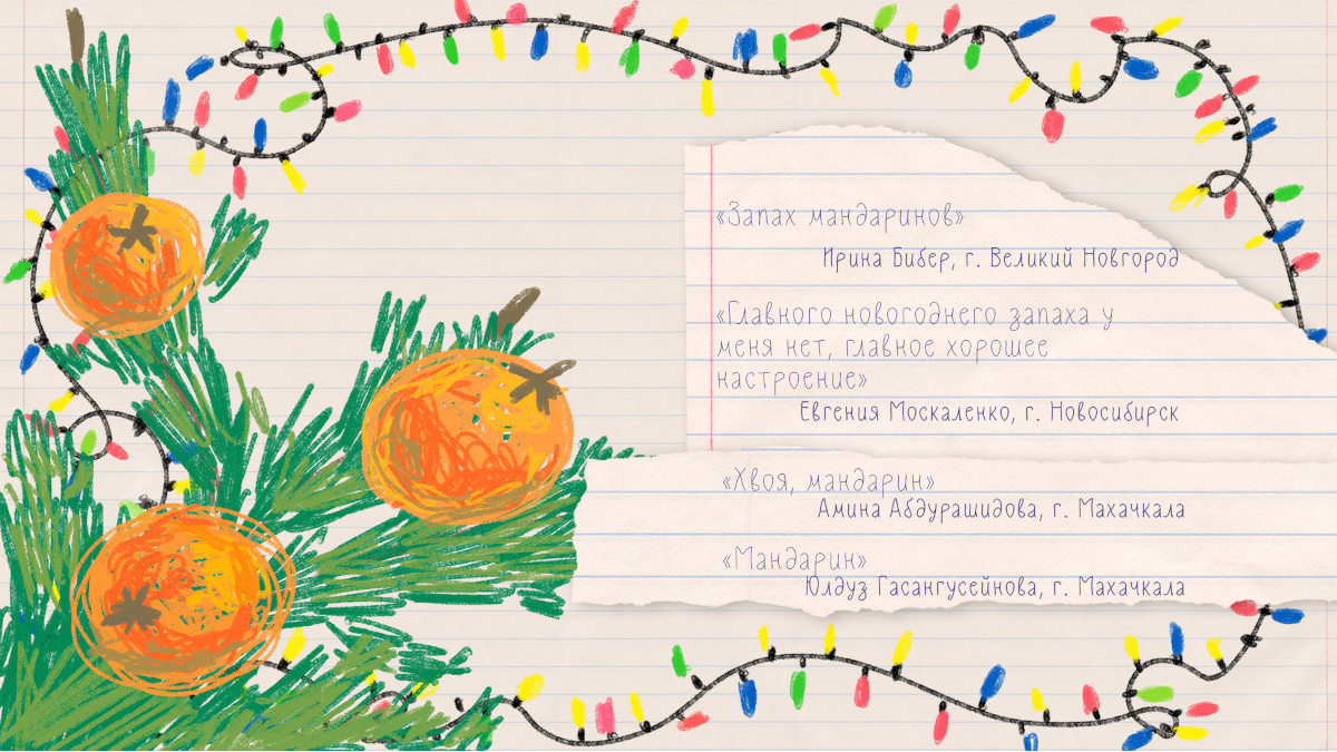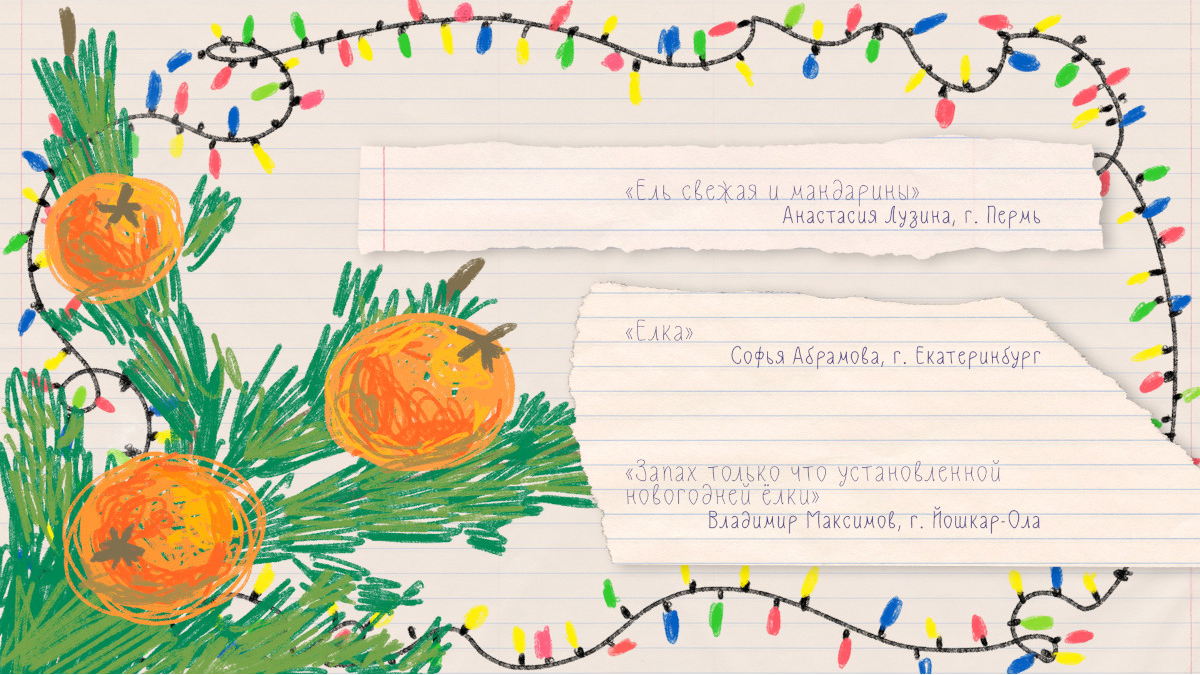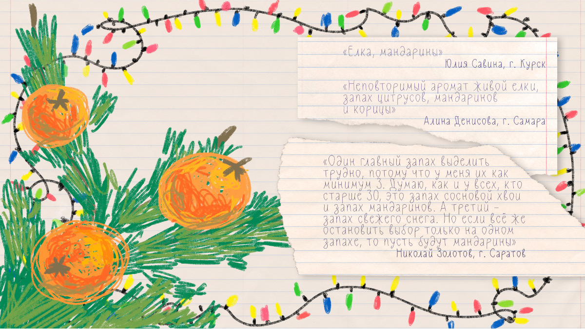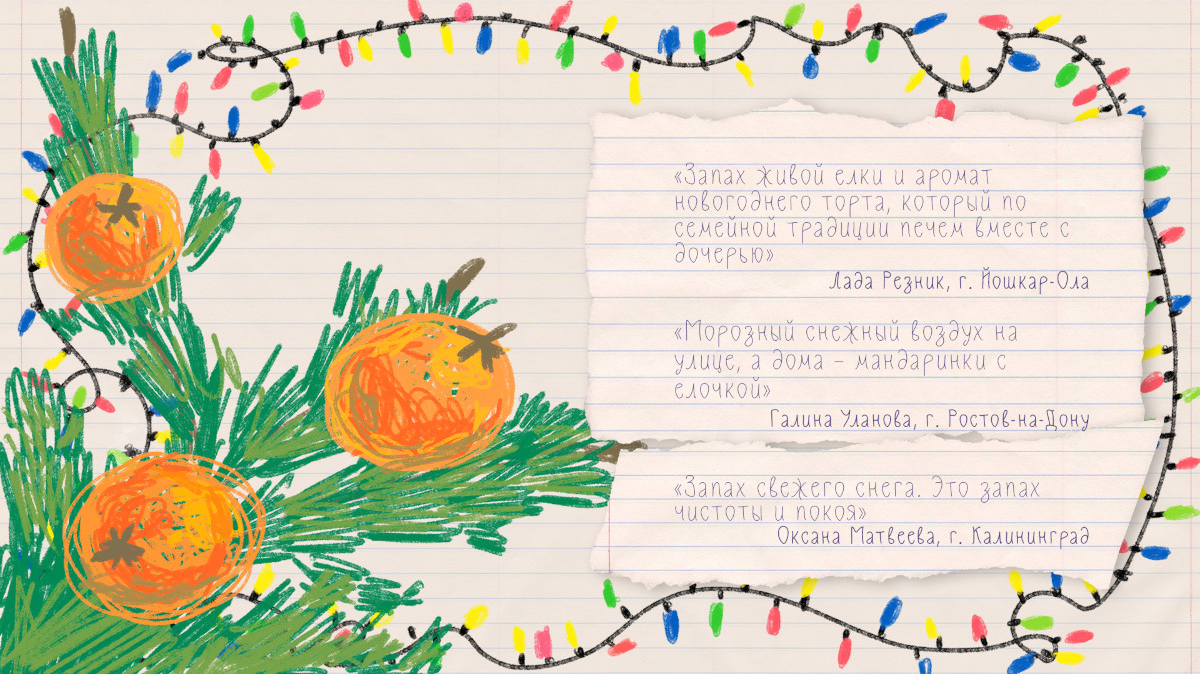 У интервьюеров Амины Абдурашидовой (г. Махачкала), Юлдуз Гасангусейновой (г. Махачкала), Юлии Савиной (г. Курск), Анастасии Лузиной (г. Пермь) и Ирины Бибер (г. Великий Новгород) Новый год пахнет хвоей и мандаринами. Для интервьюера Алины Денисовой (г. Самара) эти запахи дополняются ароматом корицы. А интервьюеры Николай Золотов (г. Саратов) и Галина Уланова (г. Ростов-на-Дону) вспоминают еще один важный аромат — запах свежего, морозного снега, который интервьюер Оксана Матвеева (г. Калининград) считает главным ароматом чистоты и покоя. Интервьюер Владимир Максимов (г. Йошкар-Ола) называет запах только что установленной новогодней елки, а Лада Резник (г. Йошкар-Ола) — аромат живой ели в сочетании с запахом новогоднего торта, который они пекут с дочерью. Для интервьюера Софьи Абрамовой (г. Екатеринбург) главный новогодний аромат — это запах елки. Для интервьюера Евгении Москаленко (г. Новосибирск) отдельного аромата праздника нет, главное — хорошее настроение.