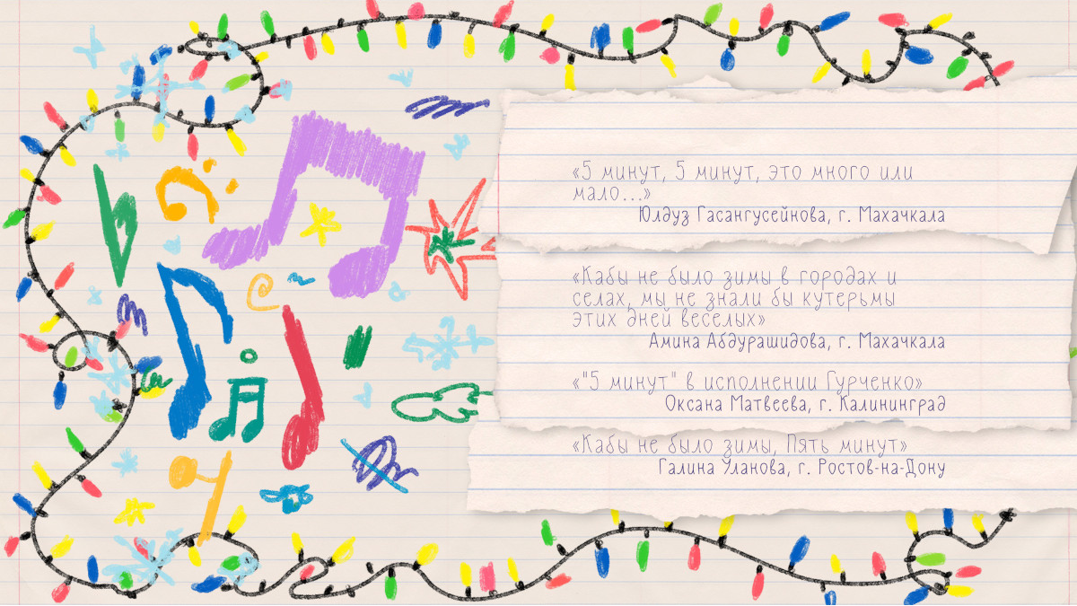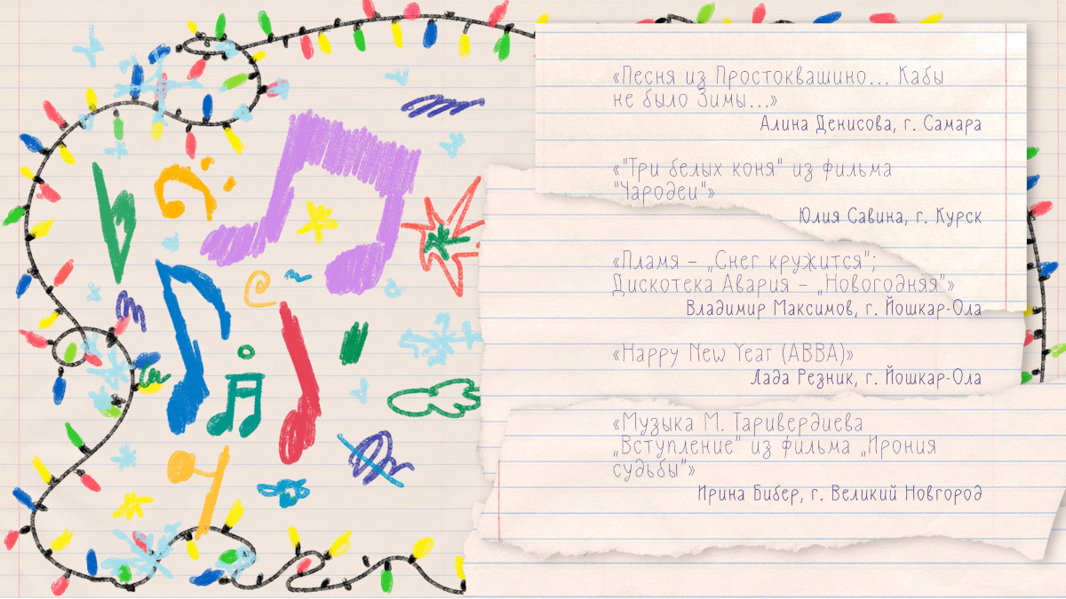 Безусловными любимчиками оказались композиции из советских кинохитов. Так, песню «Пять минут» из «Карнавальной ночи» назвали интервьюеры Оксана Матвеева (г. Калининград), Галина Уланова (г. Ростов-на-Дону) и Юлдуз Гасангусейнова (г. Махачкала). Не меньшей популярностью пользуется «Кабы не было зимы» из «Простоквашино», которую вспомнили интервьюеры Амина Абдурашидова (г. Махачкала), Алина Денисова (г. Самара) и та же Галина Уланова (г. Ростов-на-Дону). Для Юлии Савиной (г. Курск) Новый год ассоциируется с песней «Три белых коня» из «Чародеев», а для Ирины Бибер (г. Великий Новгород) — с бессмертной музыкой Микаэла Таривердиева из «Иронии судьбы».