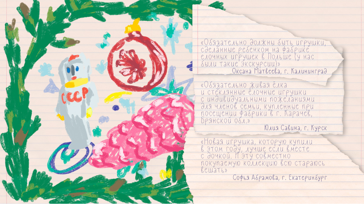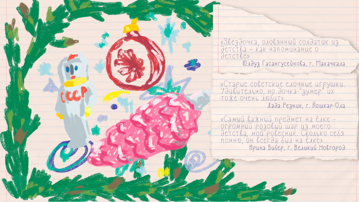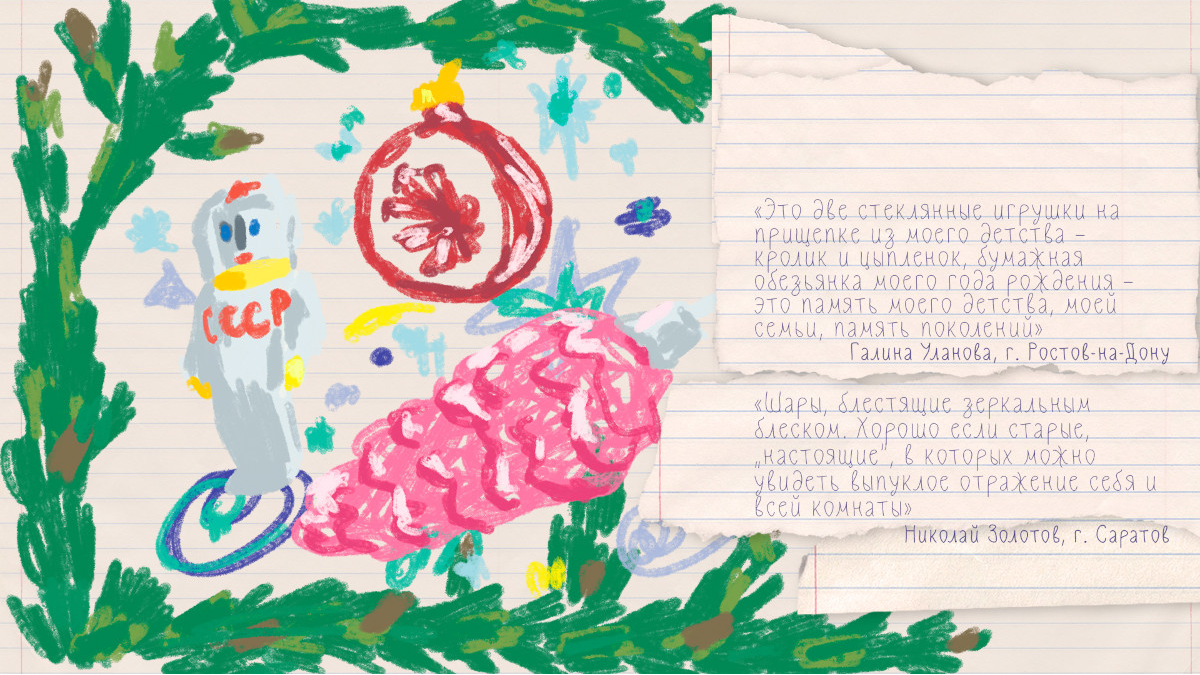 Оказалось, главная ценность елочных украшений — не только в блеске, но и в историях, которые они хранят: воспоминания о детстве, о близких, о первых творческих успехах детей. Для многих главный елочный артефакт — это привет из прошлого, хрупкая ниточка, связывающая поколения. У интервьюера Лады Резник (г. Йошкар-Ола) это старые советские игрушки, которые, что удивительно, очень любит ее дочка-«зумер». Для интервьюера Юлдуз Гасангусейновой (г. Махачкала) важны звездочка и оловянный солдатик из детства. У интервьюера Галины Улановой (г. Ростов-на-Дону) — целая коллекция реликвий: «Две стеклянные игрушки на прищепке из моего детства — кролик и цыпленок, бумажная обезьянка моего года рождения». Другой артефакт — у интервьюера Ирины Бибер (г. Великий Новгород): «Огромный розовый шар из моего детства, мой ровесник». А интервьюер Николай Золотов (г. Саратов) ценит старые «настоящие» шары с зеркальным блеском, в которых можно увидеть отражение всей комнаты.