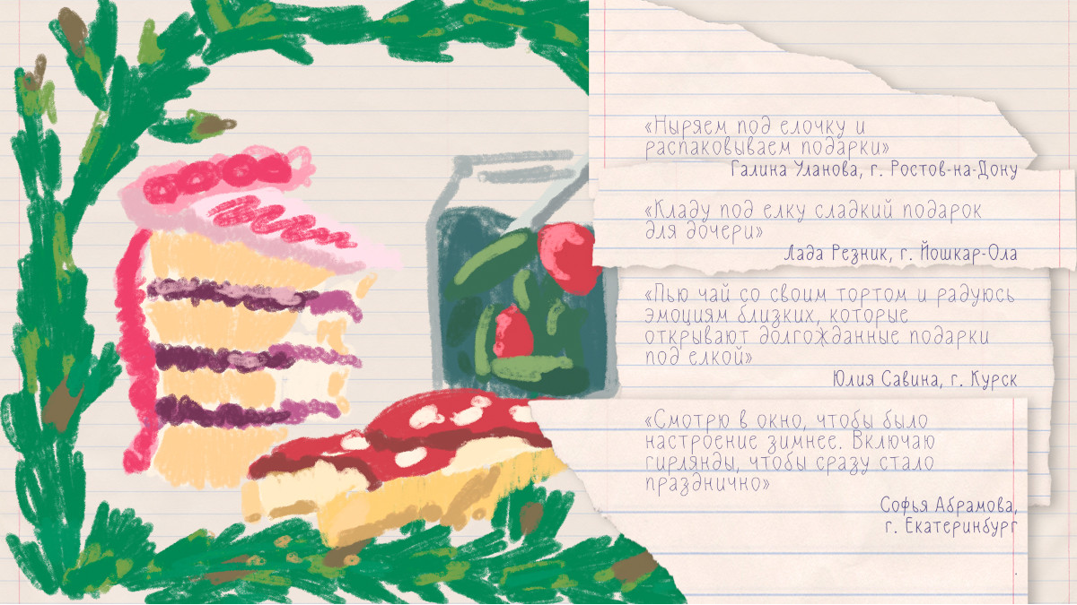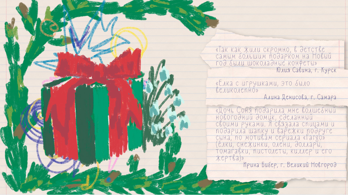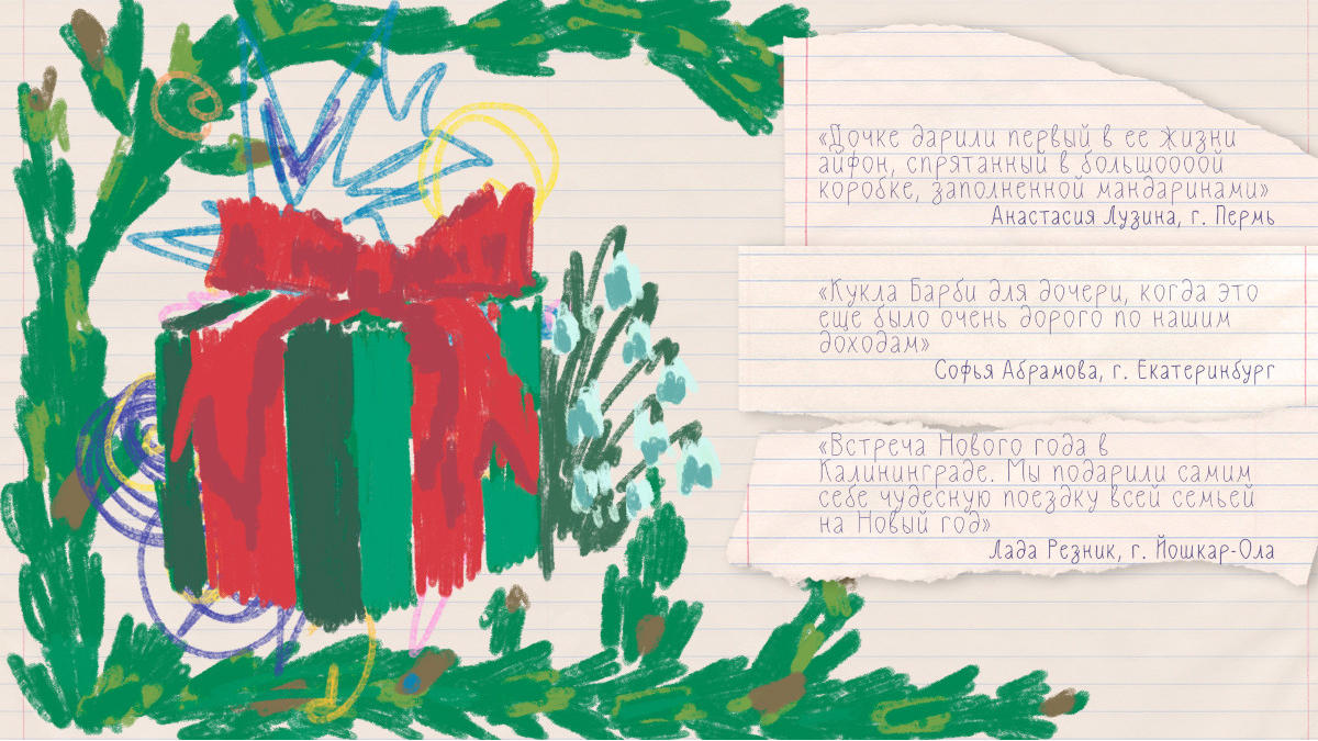 Но часто самые дорогие воспоминания связаны с подарками, которые мы делаем своим близким. Интервьюер Софья Абрамова (г. Екатеринбург) вспоминает, как подарила дочери долгожданную куклу Барби, когда это «было очень дорого». Интервьюер Анастасия Лузина (г. Пермь) — как спрятала первый айфон для дочки в большой коробке, полной мандаринов. Интервьюер Ирина Бибер (г. Великий Новгород) с теплотой рассказывает про «волшебный новогодний домик», сделанный руками дочери, и про шапку с варежками в стиле сериала Fargo, которые она связала сама.