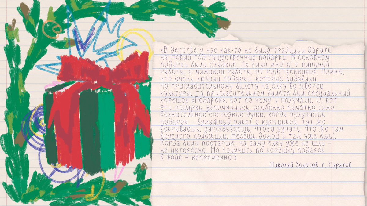 При этом для кого-то выделить один-единственный подарок оказалось сложно. Интервьюер Владимир Максимов (г. Йошкар-Ола) говорит, что не может вспомнить такого. Интервьюер Евгения Москаленко (г. Новосибирск) считает, что «все подарки на Новый год приятные». А у интервьюера Юлдуз Гасангусейновой (г. Махачкала) такой традиции в семье просто нет, что лишь подчеркивает, насколько разными могут быть наши привычки.